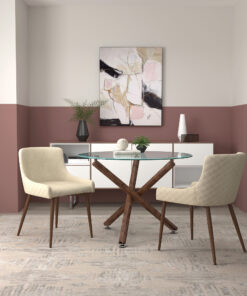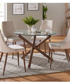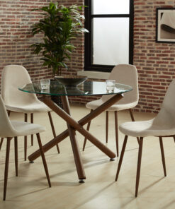 This contemporary piece will make your home resemble an art gallery with its unique and stunning design. Combining metal and glass elements, this dining table is the perfect match for a variety of different chair styles. Incorporating a 10mm tempered clear glass tabletop on top of metal legs that have a walnut finish through the process of heat transferring, the illusion of crisscrossing geometric shapes makes this piece a conversation starter. Detailed with chrome-finished glass holders and table feet, this dining table seamlessly blends a fun and visually interesting appearance with a captivating style. A perfect place to gather for meals, formal or casual.
