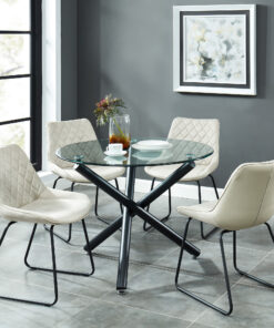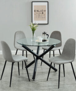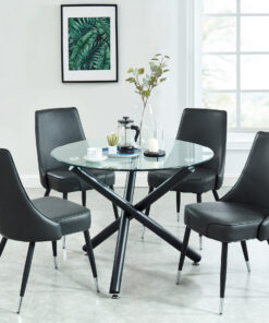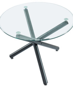 Contemporary beauty that is ideal for small spaces. The clear glass top and airy design create the impression of space. Black metal legs provide sturdy support. Great for casual dining.