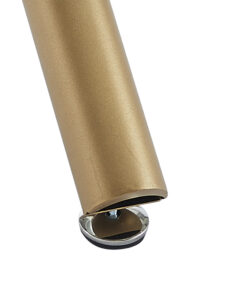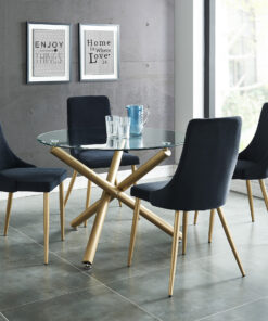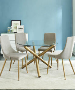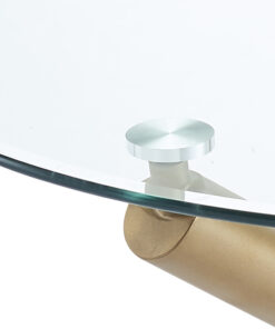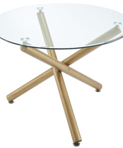 Combining metal and glass elements, this dining table is the perfect match for a variety of different chair styles. Incorporating a 10mm tempered clear glass tabletop on top of metal legs that have a matte gold finish, the illusion of crisscrossing geometric shapes makes this piece a conversation starter. Detailed with chrome-finished glass holders and table feet, this dining table seamlessly blends a fun and visually interesting appearance with a captivating style. A perfect place to gather for meals, formal or casual.