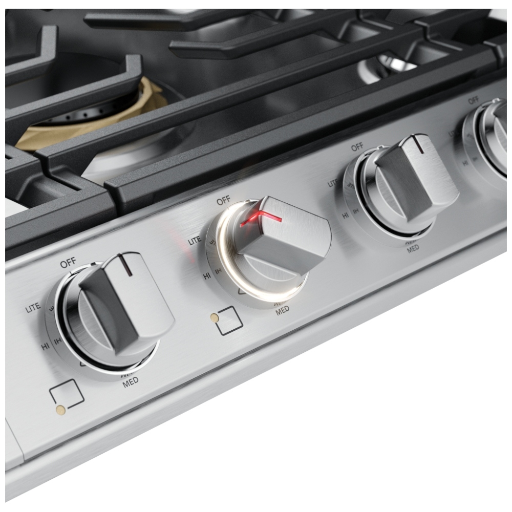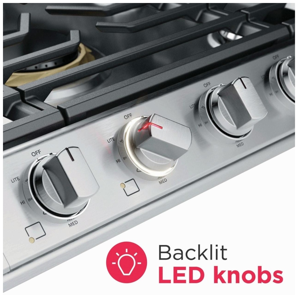 • Backlit LED knobs – illuminate when a burner is on, making it easy to see active burners at a glance and enhancing both safety and style.