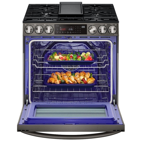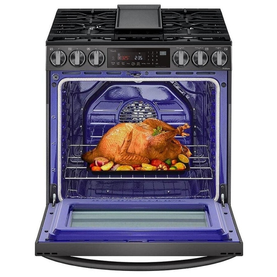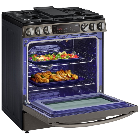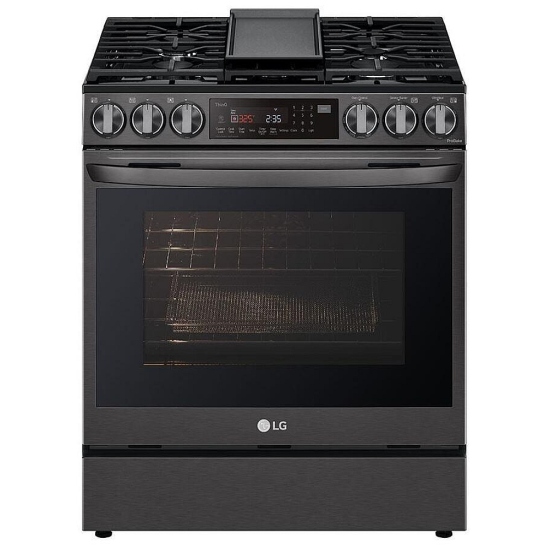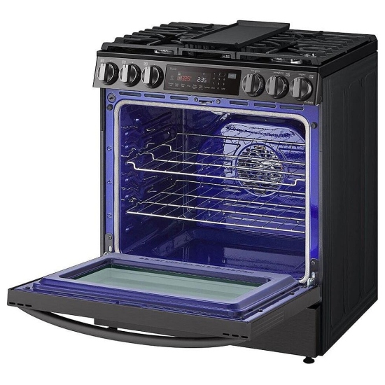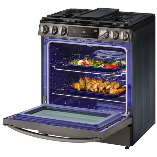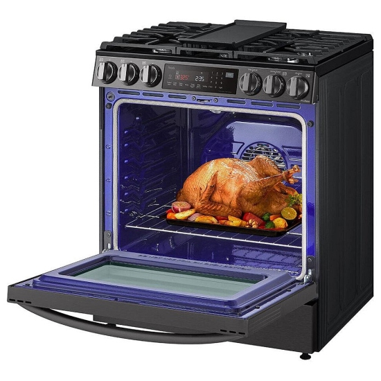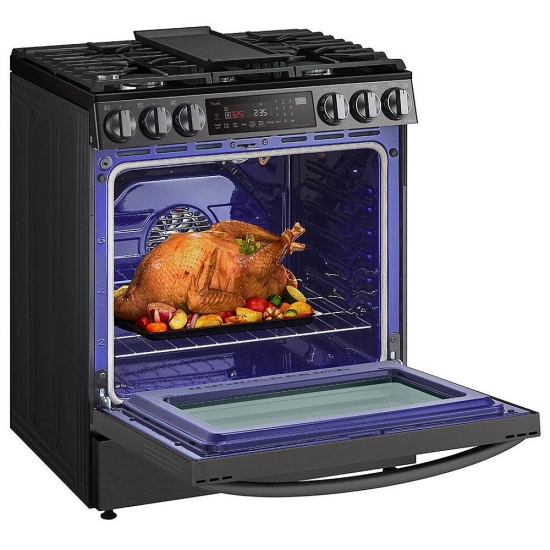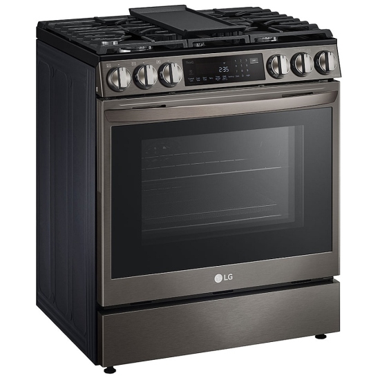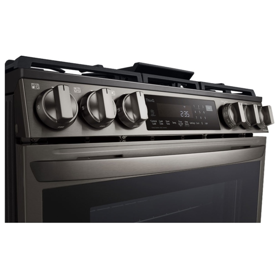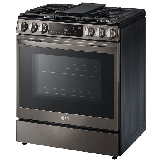 The LG LSGL6335D gas slide-in range is a smart and stylish appliance that will elevate your kitchen. With a sleek black stainless steel finish, it will be the perfect addition to any modern home.