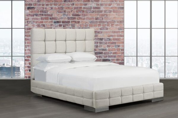 This contemporary and bold headboard and bed will transform your bedroom into a room of comfortable sophistication. With deep tufting and button inlays, and accented with bold, stylish chrome legs, this piece is designed to impress. Canadian made, hand built to order.