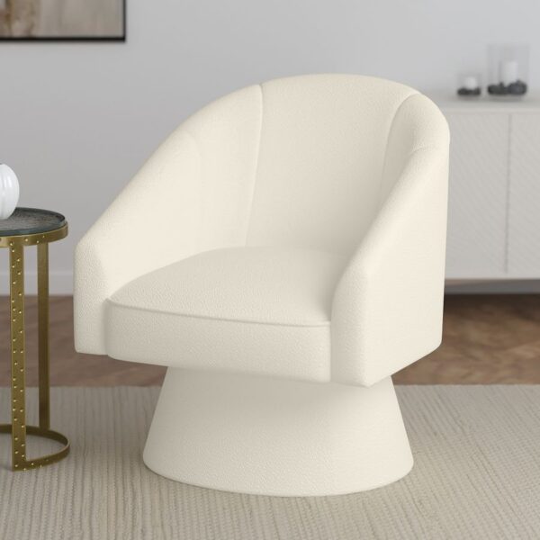 This beautiful swivel accent chair will envelope you in comfort. Every element, from the bucket seat to the textured boucle fabric, will come together seamlessly in this perfect little seat. Great in living rooms, bedrooms, or get creative a place as a dining chair in a formal living space.