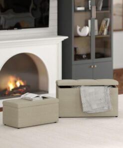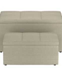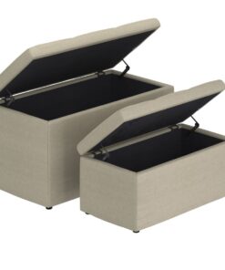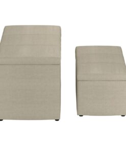 Two large capacity rectangular storage ottomans, one nesting neatly inside the other – convenience at its best! Keep the smaller stashed away for when you need extra bench seating or keep both pieces out and take advantage of places to stash games and blankets. Soft close lids are safe for little fingers, and neutral fabric upholstery will allow for an easy additional to any decor space. Spilt them up or use together as needed.