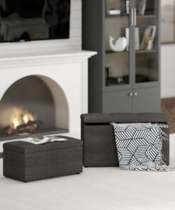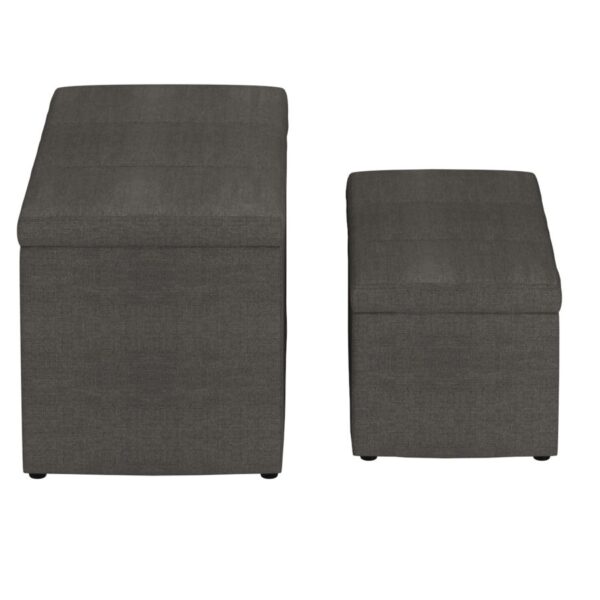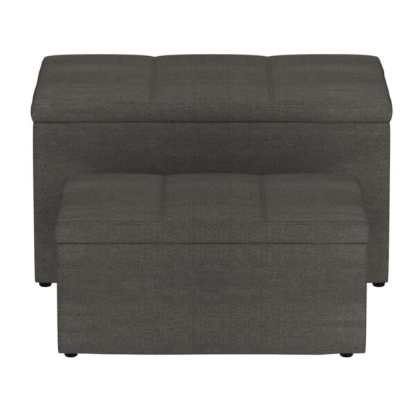 Two large capacity rectangular storage ottomans, one nesting neatly inside the other – convenience at its best! Keep the smaller stashed away for when you need extra bench seating or keep both pieces out and take advantage of places to stash games and blankets. Soft close lids are safe for little fingers, and neutral fabric upholstery will allow for an easy additional to any decor space. Spilt them up or use together as needed.