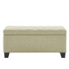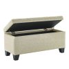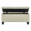Items you keep in this ultra-deep storage ottoman may be out of sight and out of mind, but this piece can stay front and centre! A perfect add-in to any space for extra seating when needed and extra storage always available. The tufted, upholstered design will work well in any space. Safety-stop hinges keep fingers safe by preventing any accidental slamming of the seat. Sturdy black legs provide stability and support in this versatile piece.
