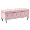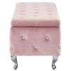 A storage ottoman can be a lavish touch to any home decor ensemble, but this ottoman is truly a one of a kind statement piece. With magnificent blush velvet upholstery, a beautiful, diamond-patterned stitching detail, and sparkling crystal button tufting, you’ll think this piece came straight off of a fashion runway. Add to it the cabriole style legs with a chrome finish and this ottoman is sure to dazzle from any angle. Attention to detail is in all of the finishes as it includes a deep multi-purpose storage compartment and safety stop hinges to ensure that closing this ottoman will feel as soft and luxurious as it looks. Whether using it for storage or plush seating, this ottoman is sure to turn any ordinary room into something palatial. Perfect for the end of the bed to add some bling to your bedroom. Or place a clear tray on top and use as an elegant coffee table.
