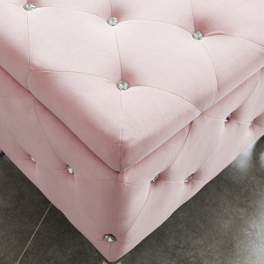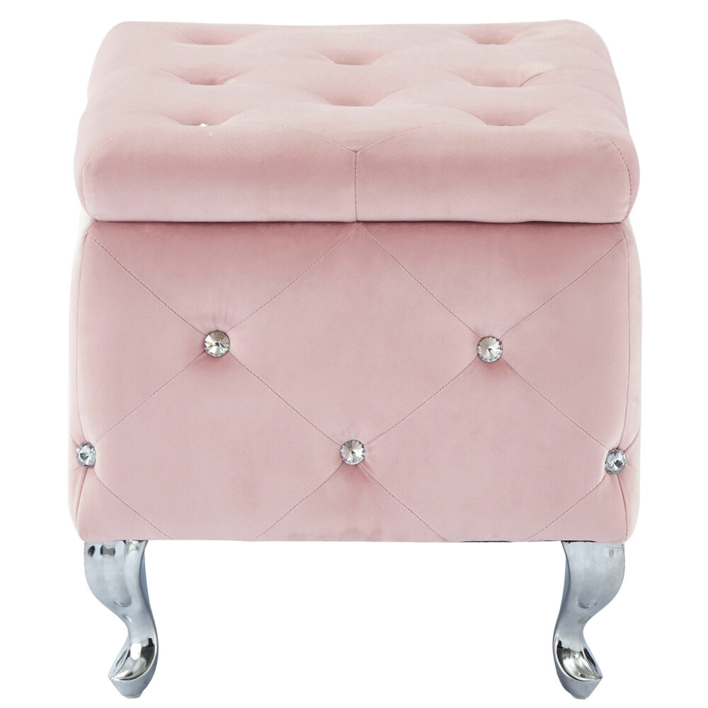 A storage ottoman can be a lavish touch to any home decor ensemble, but this ottoman is truly a one of a kind statement piece. With magnificent blush velvet upholstery, a beautiful, diamond-patterned stitching detail, and sparkling crystal button tufting, you’ll think this piece came straight off of a fashion runway. Add to it the cabriole style legs with a chrome finish and this ottoman is sure to dazzle from any angle. Attention to detail is in all of the finishes as it includes a deep multi-purpose storage compartment and safety stop hinges to ensure that closing this ottoman will feel as soft and luxurious as it looks. Whether using it for storage or plush seating, this ottoman is sure to turn any ordinary room into something palatial. Perfect for near the door to add some bling to your entryway. Or place a clear tray on top and use as an elegant accent table.