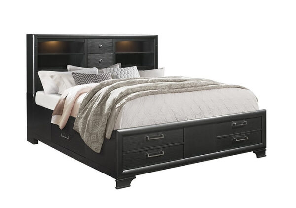 Lots of features and functionality are smartly tucked away in this modern classic bedroom group. Between the storage headboard, under-bed drawers and tall, 9 drawer dresser, it’s easy to keep your room a showplace. With Grey lacquer finish on carved drawer fronts and Nickel hardware to complete the look.