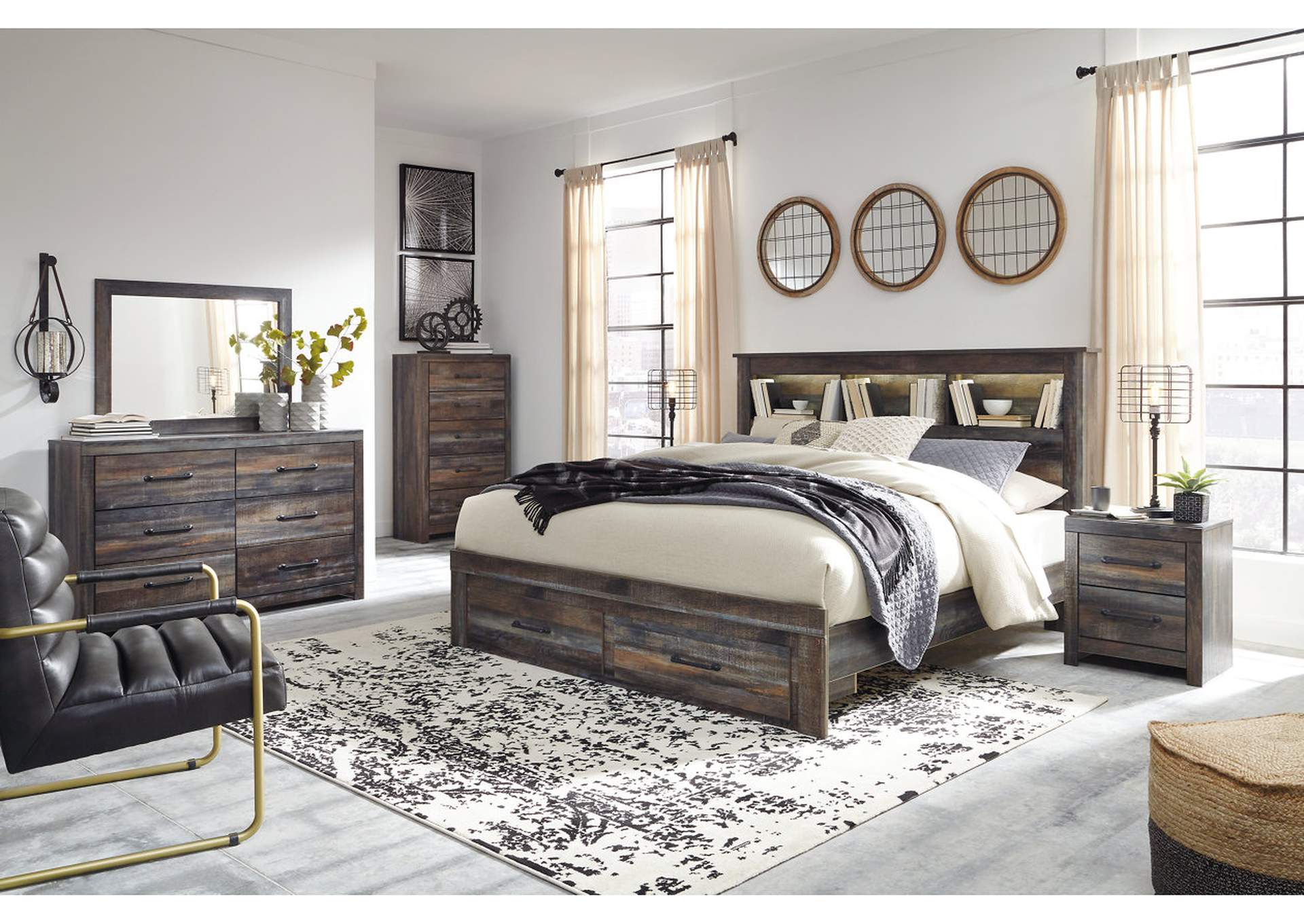 This queen-size bookcase bed with storage, dresser, mirror, chest of drawers and nightstand is a refined take on barn board beauty. Its complex, replicated wood grain showcases hints of burnt orange and teal tones for a sense of weatherworn authenticity. Three open cubbies lined with a dimming LED light strip keep bedtime reads top of mind. Double drawers at the foot of the bed come in mighty handy. The dresser, chest and nightstand drawers are lined with faux linen laminate with industrial dark-tone hardware completing this rustic and industrial style bedroom. Mattress and foundation/box spring available, sold separately.