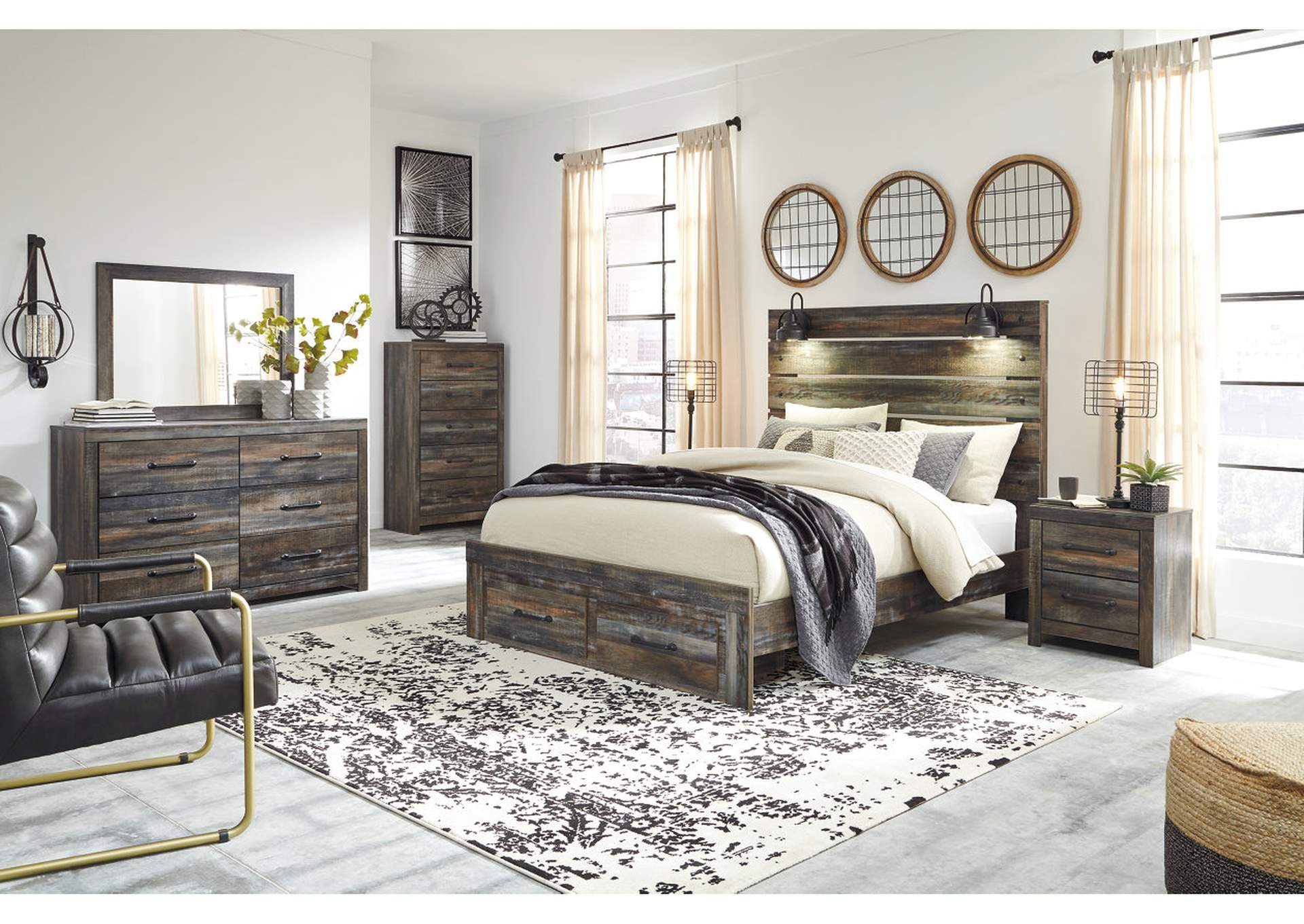 This queen-size panel bed with storage, dresser, mirror, chest of drawers and nightstand is a refined take on barn board beauty. Its complex, replicated wood grain showcases hints of burnt orange and teal tones for a sense of weatherworn authenticity. Love to read in bed? You’re sure to find the pair of retro-chic light sconces and USB plug-ins on the open-slat style headboard such a bright idea. Double drawers at the foot of the bed also come in mighty handy. The chest, nightstand and dresser’s smooth-gliding drawers lined with faux linen laminate and industrial dark-tone hardware complete this rustic and industrial style bedroom. Mattress and foundation/box spring available, sold separately.