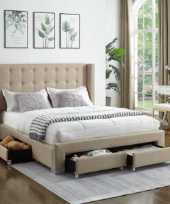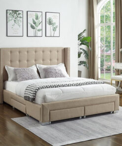 Beige Fabric Wing Bed with Nailhead Details and Chrome Legs.