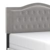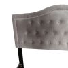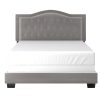 Beautiful and elegant styling on this modern upholstered bed-in-a-box. The sturdy slats and support legs create a solid foundation for your box spring and mattress. Button tufting and nail head detailing on the crown-shaped headboard lend an elegant air of high-end design. A perfect piece for a principle bedroom or child’s room.
