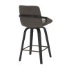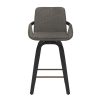The cushioned seat, back and arms on this beauty of a counter stool will provide hours of seated support. The bentwood legs are beautifully finished in black and the cushioning is all upholstered in a durable charcoal performance fabric – creating the perfect modern mid-century piece. The footrest is finished in dull aged gold and provides additional comfort. Full swivel allows for ease of use at any counter space.