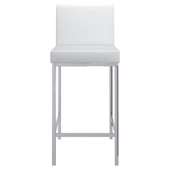 Contemporary counter height stool with faux leather and shiny chrome finishing. Combined, these two materials create a modern piece that will work will with any decor. The low back provides ample back support while adding to the minimalist appeal. Great for a casual breakfast bar or for the fancy basement bar where you can spend hours conversing with guests.