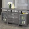 This modern buffet-style server features three drawers, two glass cabinets and a long table-top providing tons of functional storage for your dining and entertaining essentials. Its dark toned finish brings a sophisticated and contemporary feel to any dining space. Available in a grey finish with silver-toned hardware.