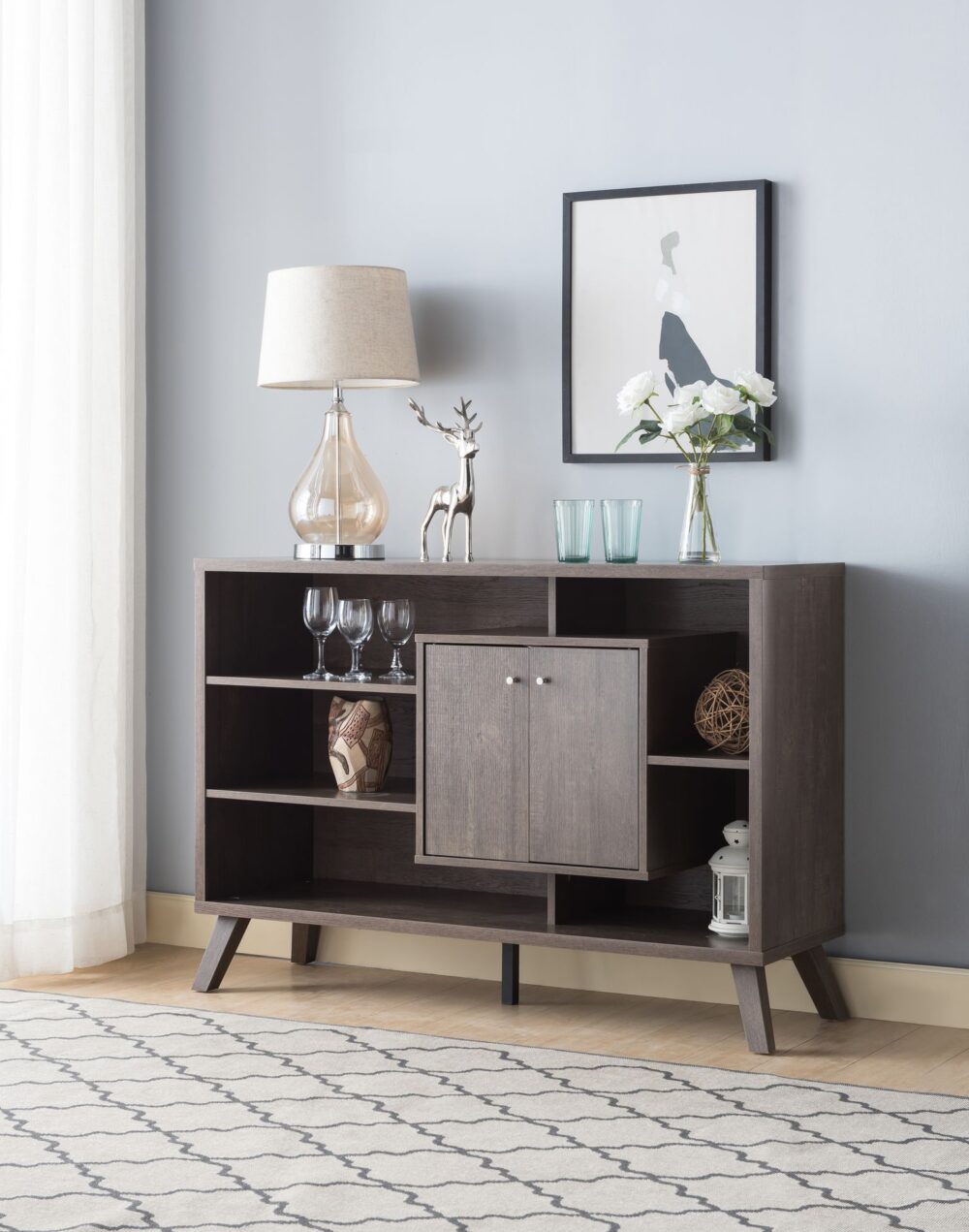 Add a touch of glamour to your in-home dining experience with this stunning multi-tiered buffet. The ample storage space provided by the storage cabinet and five open shelves combine form and functionality. It lustrous sheen and polished silver hardware enhance elegance, and the rich walnut finish brings sophistication and modernism to your dining space.
