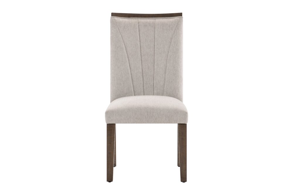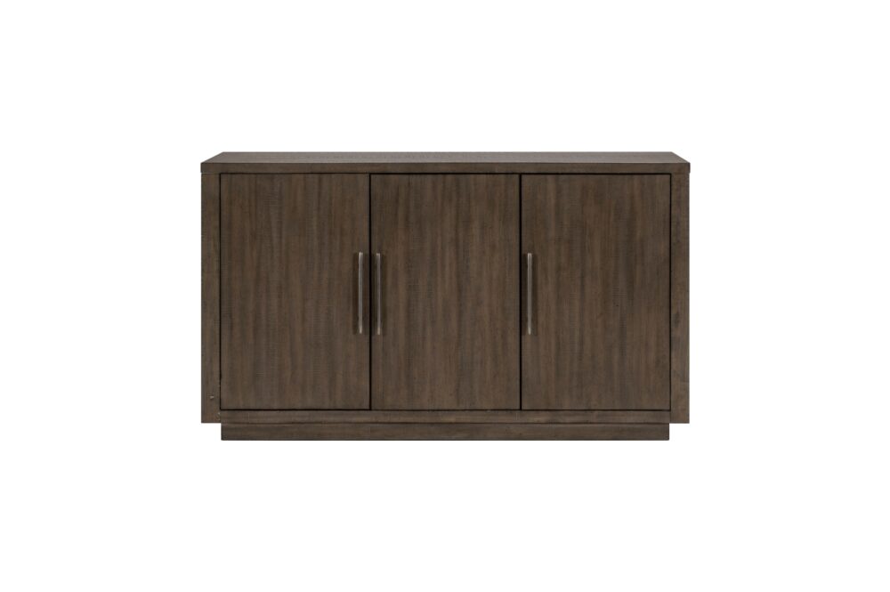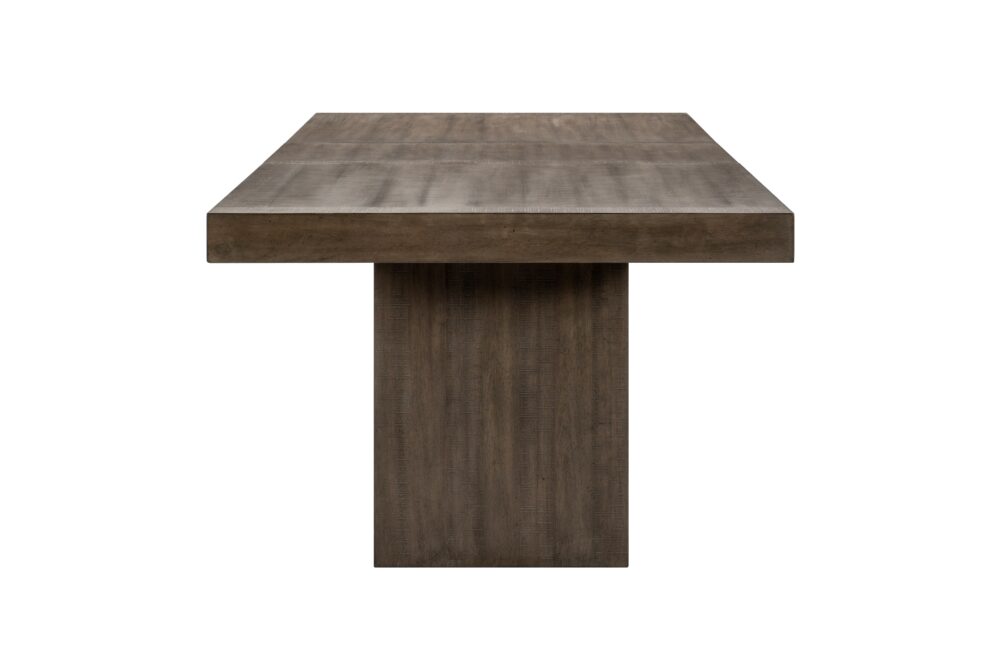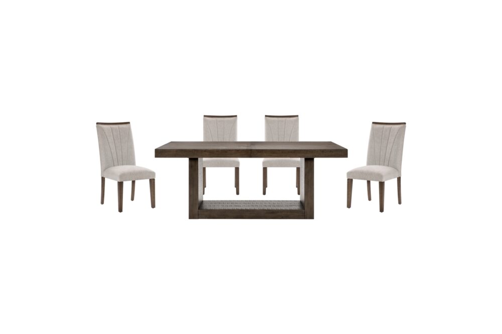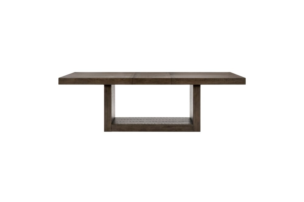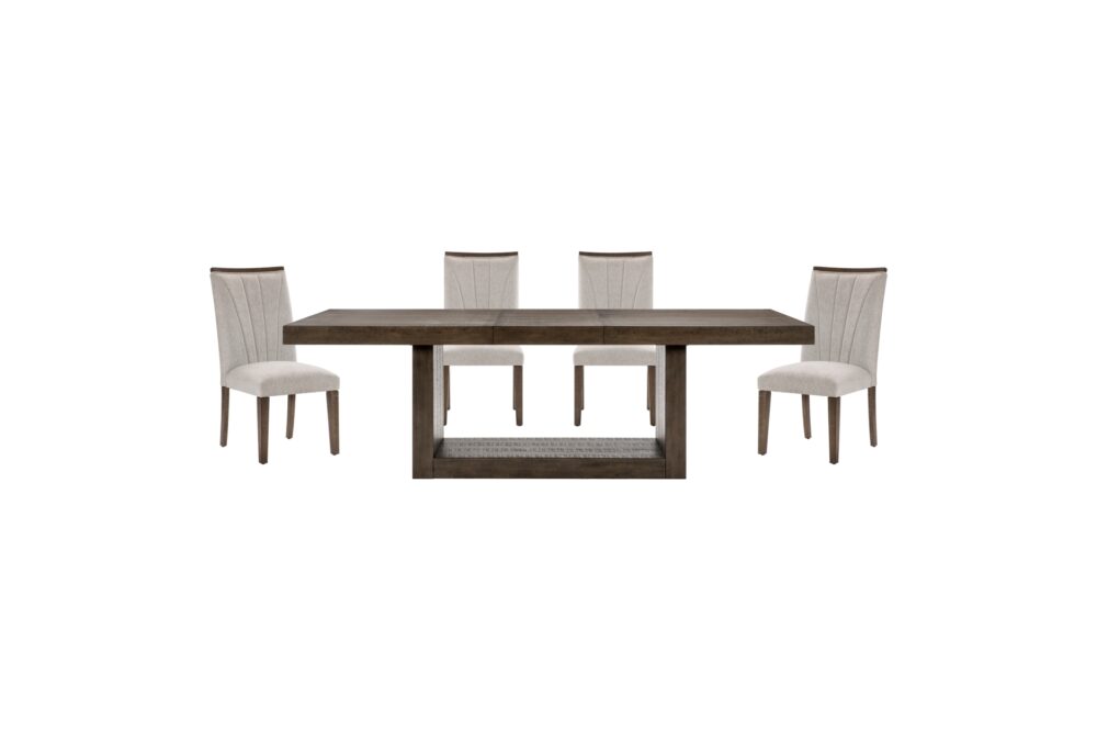 In a break from the minimalistic styling of contemporary design, the Brookings Collection provides a substantial platform for your dining pleasure. The acacia veneer of the collection is treated to a brown finish, its hue a neutral addition to your space. An open box-frame rectangular pedestal supports the tabletop. The collection’s side chairs feature textured gray fabric seats with a wood top-rail and fan-stitched seatbacks. An accompanying server provides ample behind door in-space storage for your linens and tabletop décor.