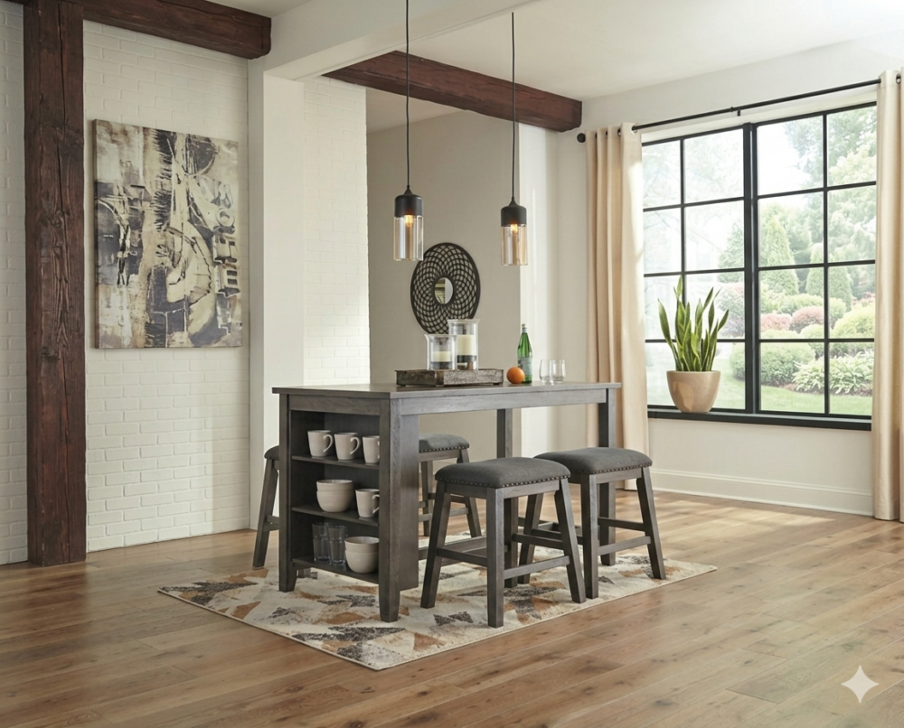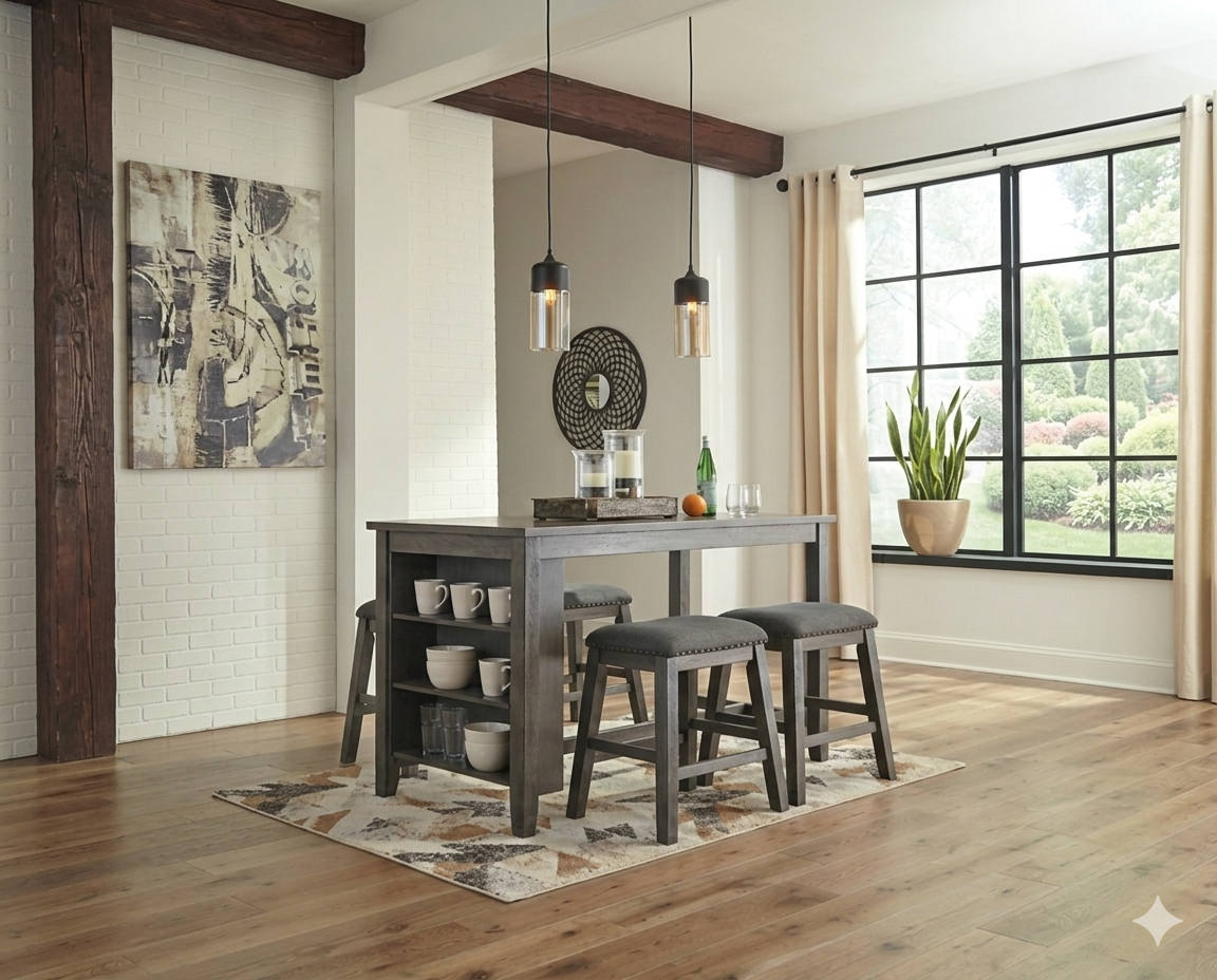 Bring a relaxed yet refined sense of good taste to your space with this 5-piece counter-height dining set. The antiqued gray wash finish gives the clean-lined design a casually cool sensibility. The table’s side shelves cleverly balance form and function while the textured gray upholstery of the stools serves up high style. This set is an inspired choice for modern farmhouse living