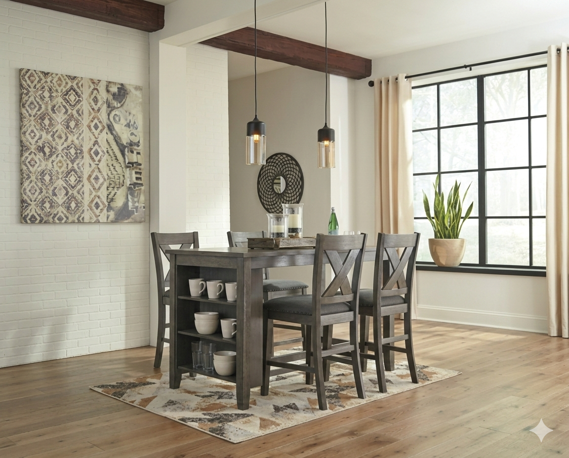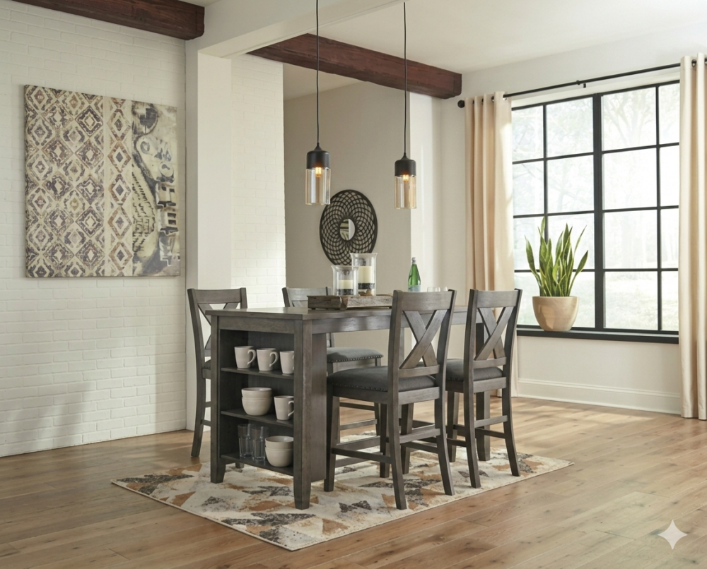 Bring a relaxed yet refined sense of good taste to your space with this 5-piece counter-height dining set. The antiqued gray wash finish gives the clean-lined design a casually cool sensibility. The table’s side shelves cleverly balance form and function while the classic x-back design and textured gray upholstery of the stools serves up high style. This set is an inspired choice for modern farmhouse living.