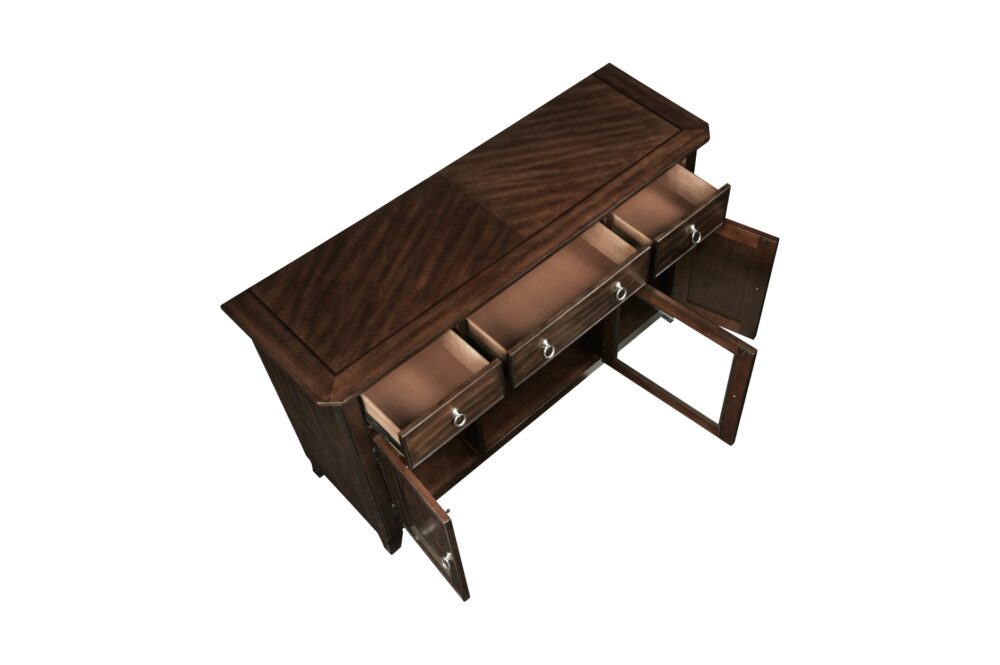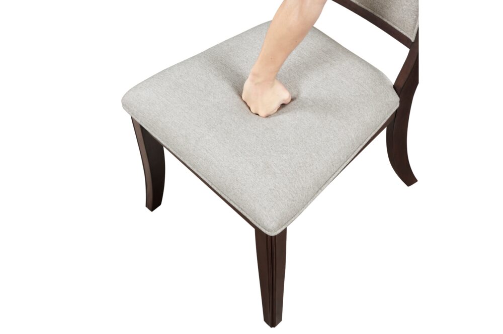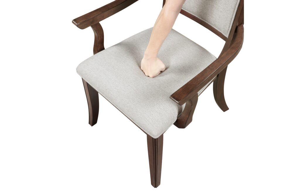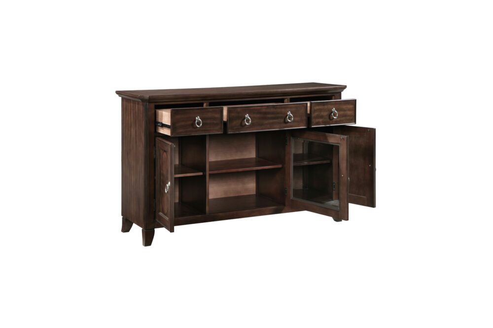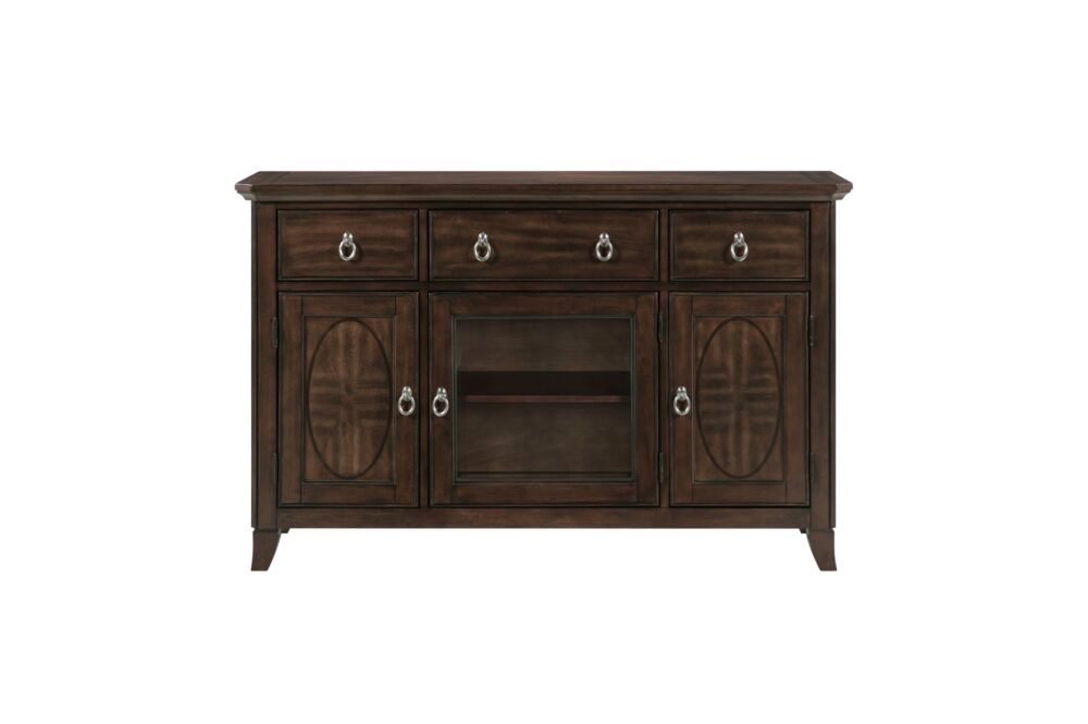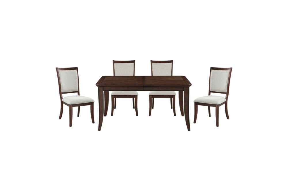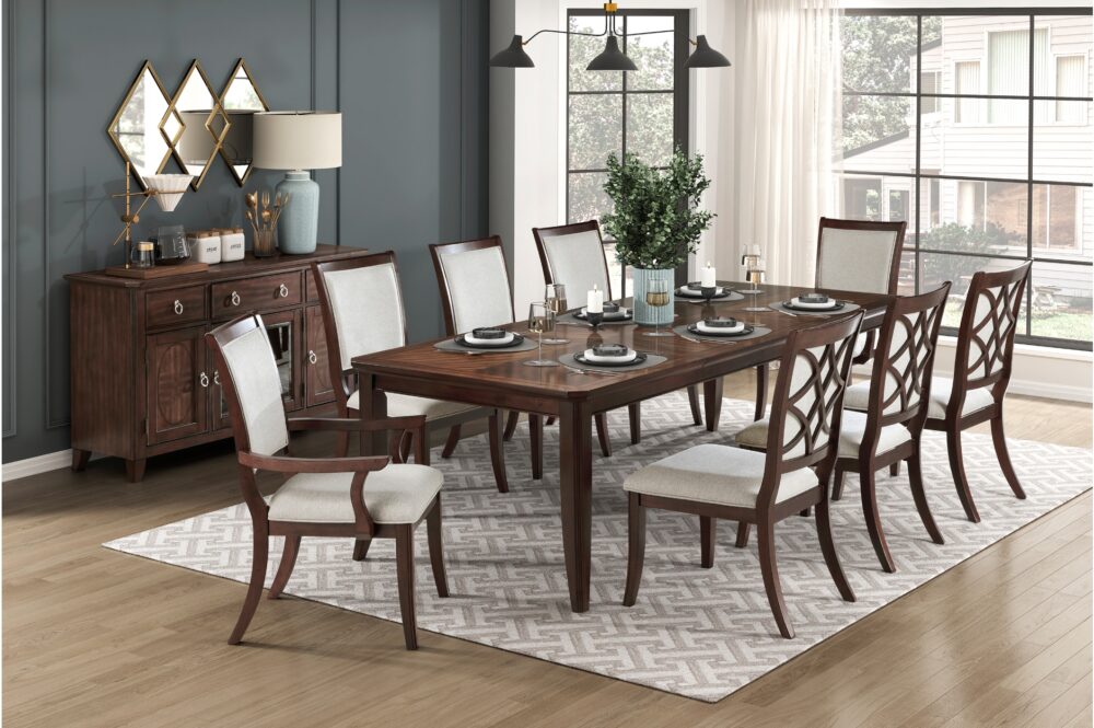 Transform your dining or living space into a haven of timeless elegance and practical sophistication with the Claymont Collection. This meticulously crafted ensemble, featuring an extendable dining table, arm chairs, side chairs, and a server, is designed to elevate your home with its rich cherry finish and striking dark walnut inlay. Each piece is constructed from high-quality birch veneer, solid wood, and engineered wood, ensuring durability and lasting beauty. The extendable dining table, comfortably seating up to eight, offers seamless flexibility for any gathering, while the plush, textured fabric upholstery of the arm and side chairs provides exceptional comfort for extended enjoyment. The server adds both style and functionality with its ample storage, including smooth-gliding dovetail drawers and adjustable shelved cabinets, all accented by polished chrome tone ring pulls. Designed to blend traditional charm with modern comfort, the Claymont Collection brings a cohesive and refined aesthetic to your home, creating a welcoming and stylish environment for family and friends. While assembly is required, the result is a beautifully coordinated collection that enhances both the aesthetic and functionality of your living space.