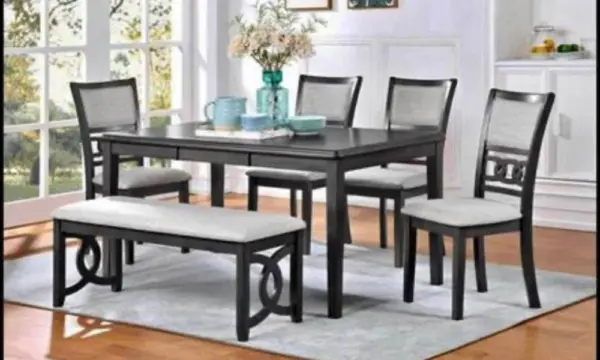 This is a six-seater dining table consisting of four chairs and a two-seater couch. The table is made up of black marble and the legs are made up of wood which is black in shade. The chairs have black coated legs and grey color cushioning on the seats and half of their back.