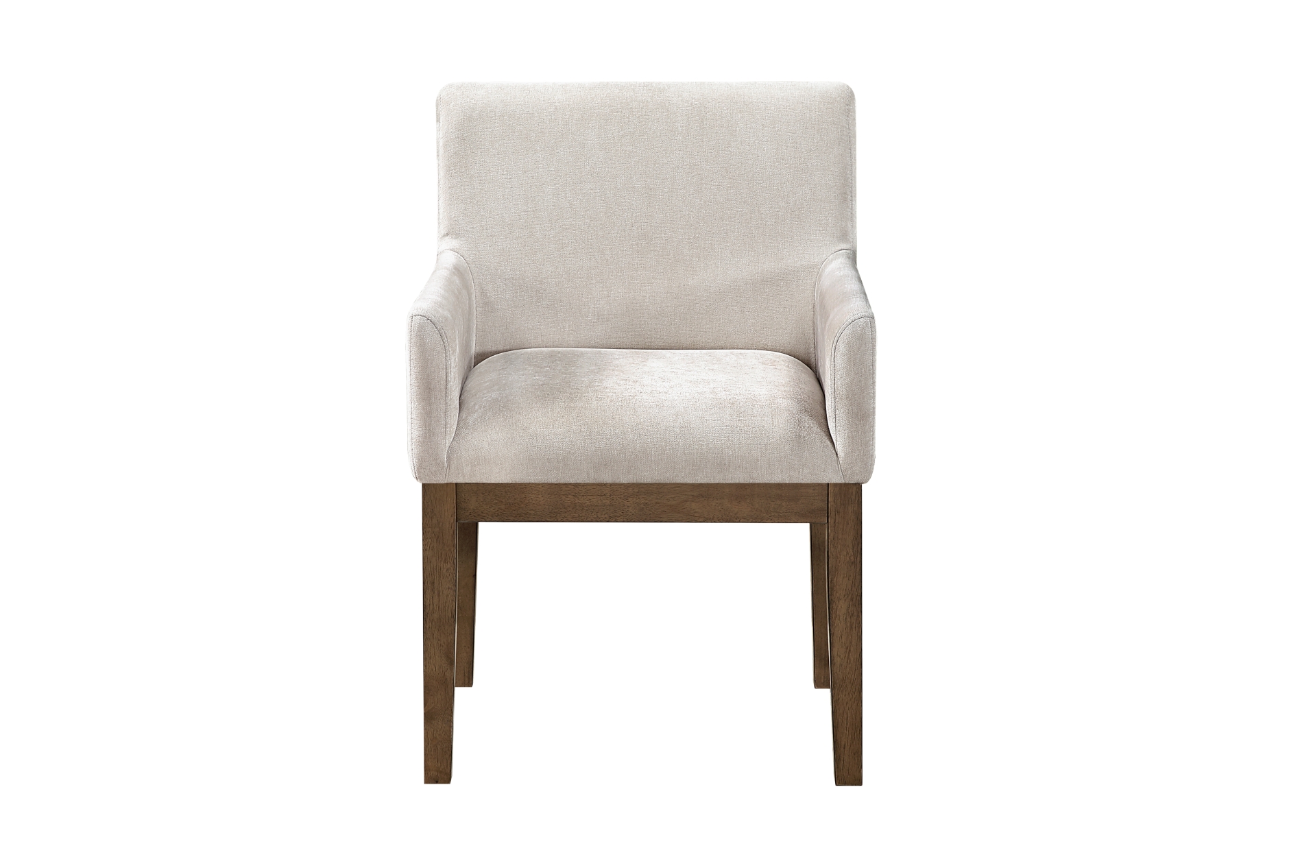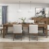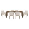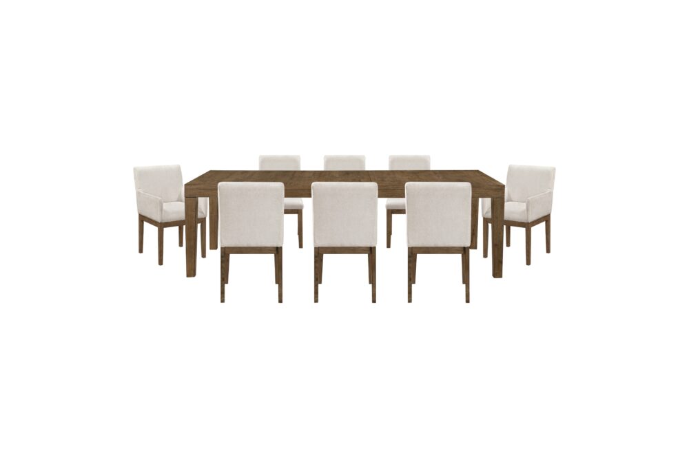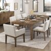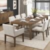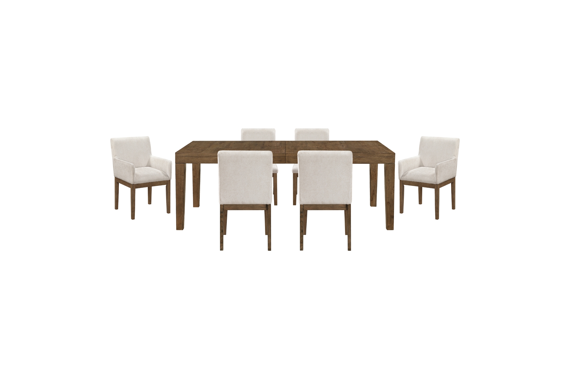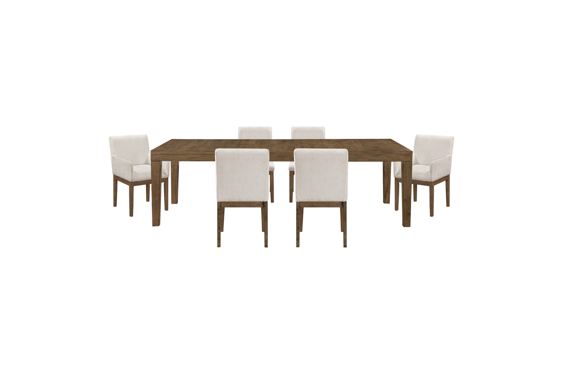 Enhance your dining space with this luxurious French oak veneer dining set. The rich brown finish adds timeless warmth, complementing the inviting arm and side chairs upholstered in premium textured fabric. The functional server provides essential storage, accented by stylish antique bronze tone bar pulls. This complete dining set combines high-end materials and quality craftsmanship for a durable, sophisticated upgrade perfect for everyday use or formal entertaining.