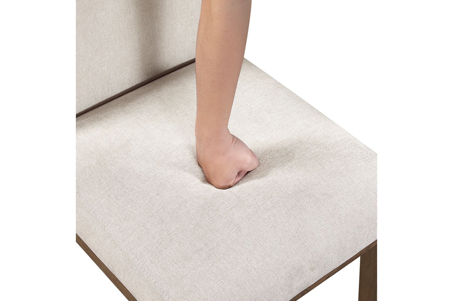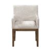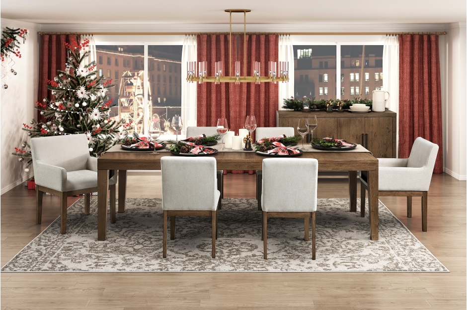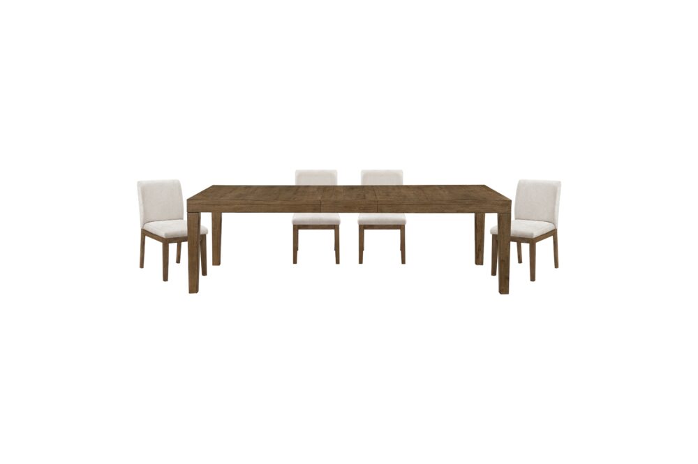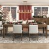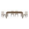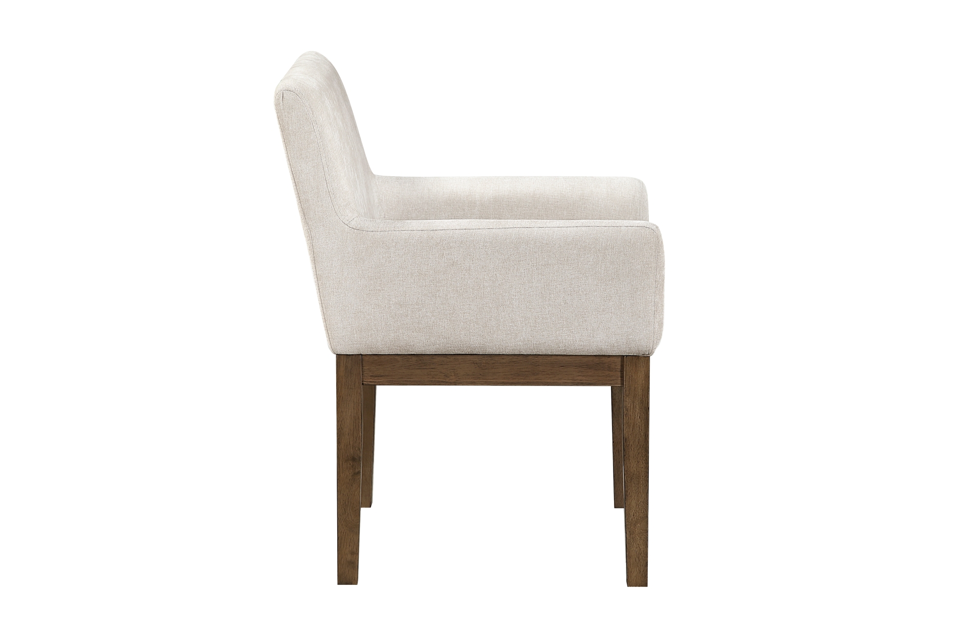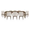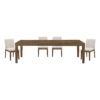 Enhance your dining space with this luxurious French oak veneer dining set. The rich brown finish adds timeless warmth, complementing the inviting arm and side chairs upholstered in premium textured fabric. The functional server provides essential storage, accented by stylish antique bronze tone bar pulls. This complete dining set combines high-end materials and quality craftsmanship for a durable, sophisticated upgrade perfect for everyday use or formal entertaining.