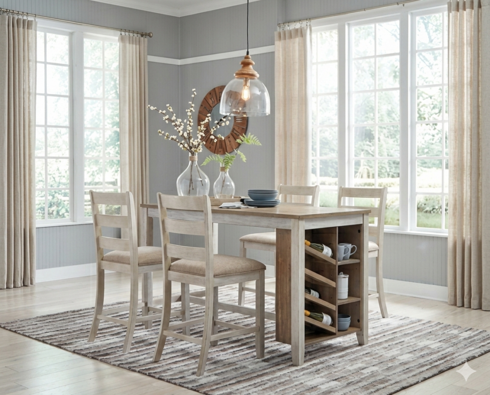 Raise the bar on small space living with this 5-piece counter-height dining set. An inspired choice for coastal chic or modern farmhouse settings, this strikingly simple table marries a brown tone plank-effect top with a rubbed-through grayish white base for timeworn appeal. The table’s side shelves and 8-bottle wine rack cleverly balance form and function while the comfortably cushioned bar stools with classic ladderback styling serve up high style.
