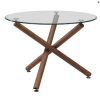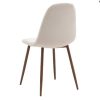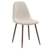 Incorporating a 10mm tempered clear glass tabletop on top of metal legs that have a walnut finish through the process of heat transferring, the illusion of crisscrossing geometric shapes makes this piece a conversation starter. Detailed with chrome-finished glass holders and table feet, this dining table seamlessly blends a fun and visually interesting appearance with a captivating style. This trendy chair showcases a sleek and coherent design. Composed of a comfortable, curved wood seat frame with foam covered in fabric upholstery this chair balances simplicity with style. Made with metal legs in a walnut finish through the process of heat transferring, this chair will boast sturdiness along with the sleek look and comfort.