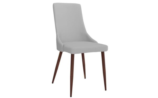 Classic mid-century modern styling with a contemporary twist. Faux leather upholstery sits beautifully on the walnut-wrapped metal legs. Clean line design is an easy match to a variety of table styles. Use in a formal or casual setting.
