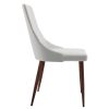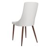 Classic mid-century modern styling with a contemporary twist. Faux leather upholstery sits beautifully on the walnut-wrapped metal legs. Clean line design is an easy match to a variety of table styles. Use in a formal or casual setting.