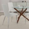 Composed of wood, faux leather, and metal, this side chair is a show stopper all its own. With its curved wood seat frame, seat cushion covered in faux leather upholstery with stitching details on the back, and chrome-finished metal legs, this chair unifies a multitude of elements all into one perfectly composed design. The comfortable seat allows for hours of conversation around the dinner table, while the slim, tapered look of the metal legs adds a splash of sophisticated design. The versatility of this unique piece allows it to be styled with a variety of table styles and finishes