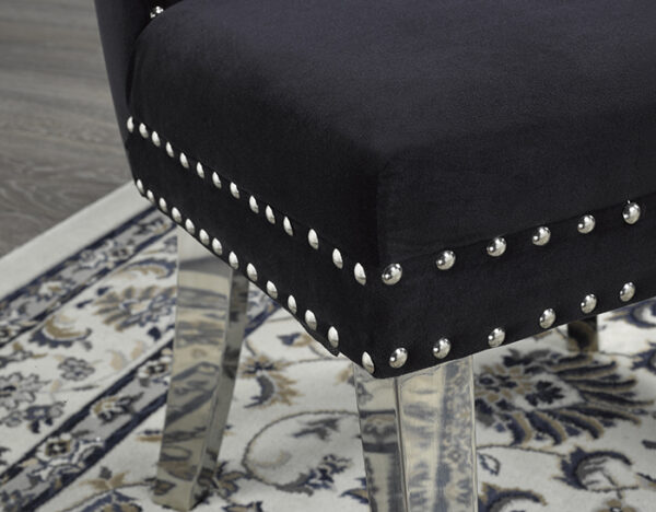 These set of 2 dining chairs a welcome addition to any chic dining space. The elegant but durable polyester fabric features a luxurious velvety finish for an inviting look and feel. Traditional tufted accents on the comfortably cushioned seat back are a handsome complement to the sophisticated and sturdy nail-head trim. A convenient chrome-plated pull handle on the back adds modern appeal and makes it easy to re-position this dining chair as needed. With its fashionable colour and chrome finished legs, this versatile chair fits seamlessly into any contemporary or traditional décor scheme. Group multiple dining chairs around a table or bar to create an elegant dining set or place them individually around your home as accent pieces or for extra seating when entertaining.