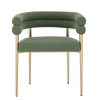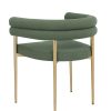 Enhance your dining space with theses exquisite Allure Dining Chairs. This captivating ensemble consists of two dining chairs, radiating contemporary styling that effortlessly blends with most existing interior decors. The plush seating invites you to indulge in luxurious comfort, while the premium fabric cover adds a touch of elegance to the overall design. Adorned with a mesmerizing green hue, these chairs create a visually stunning contrast against the opulent gold-finished metal frames. Every detail of these chairs exudes sophistication, making them the perfect addition to elevate your dining experience to new heights.