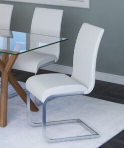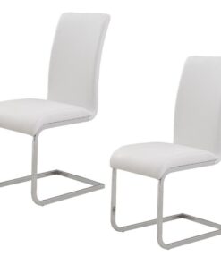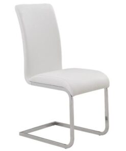 Contemporary style chair with chromed metal frame and faux leather seat. Available in black or white faux leather, the subtle curves on the chair back and seat provide plenty of comfort. Perfect for a dining set or even as accent seating.