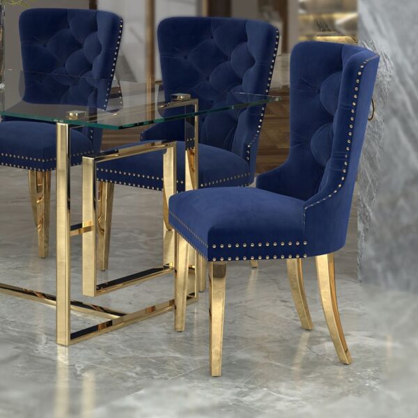 - Stainless steel legs in a polished gold finish and gold ring accent on back