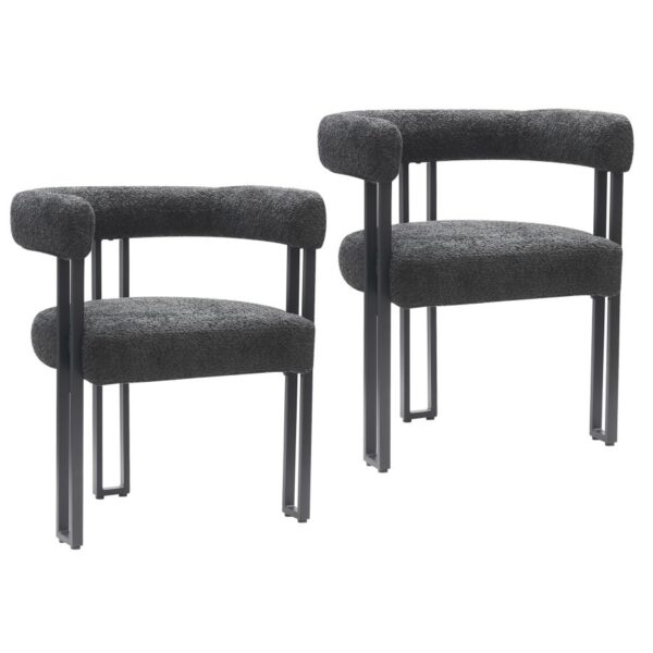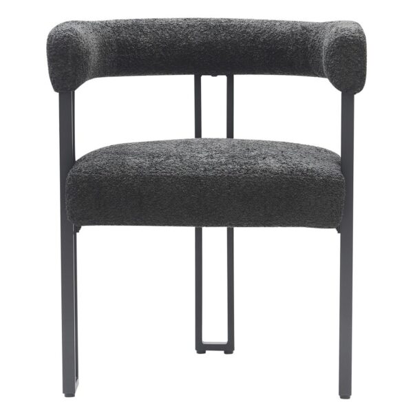 Bring the magazine-worthy dining experience to life with these beautiful, boucle-upholstered dining chairs. The textured fabric is quickly becoming a design staple for creating that high-end feel in your space. The square-line black metal frames and supports the chair perfectly, providing hours of seated comfort. Perfect for formal dining spaces, or kick up your everyday dining experience and pair with your casual kitchen table.