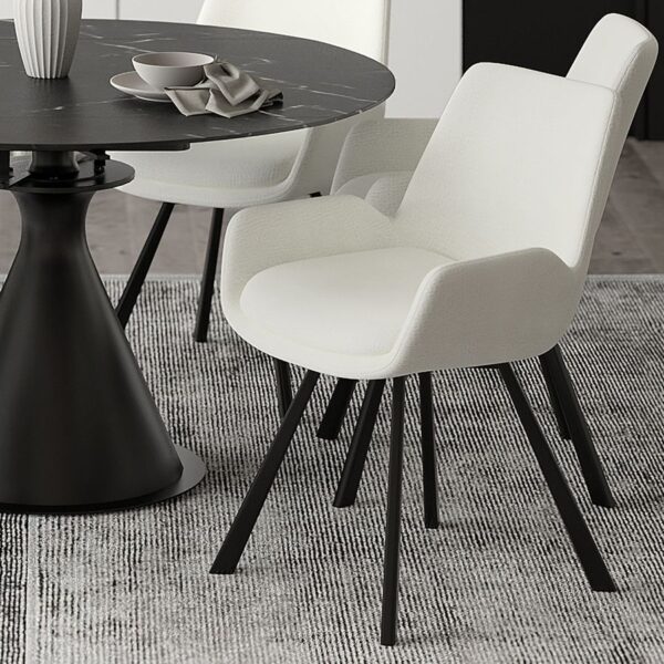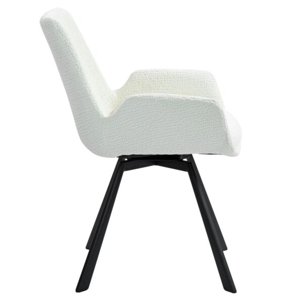 The textured chenille fabric of this dining chair will simply make you swoon…soft and comfortable, easy to wipe clean, and simply beautiful! Welded metal base provides sturdy support and the return swivel on the base will add a fun and unexpected element to your seated experience. The angled back, curved seat and arms add a formal touch to your space, but these chairs are just as well suited for casual dining spaces. Black metal legs allow for any easy match to a variety of table styles.