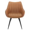 The return-swivel on this chair will kick up the design value of your space with every seated experience. Great as a dining chair, or as an accent piece in the living room or in a bedroom. The welded metal legs provide sturdy support and the contoured seat is comfortable and inviting. Faux leather upholstery is easy to wipe clean and the vintage finish adds a level of warmth. Warm, earthy tones and black metal legs combine to create the perfect modern boho-chic armchair.