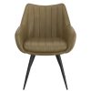 The return-swivel on this chair will kick up the design value of your space with every seated experience. Great as a dining chair, or as an accent piece in the living room or in a bedroom. The welded metal legs provide sturdy support and the contoured seat is comfortable and inviting. Faux leather upholstery is easy to wipe clean and the vintage finish adds a level of warmth. Warm, earthy tones and black metal legs combine to create the perfect modern boho-chic armchair.