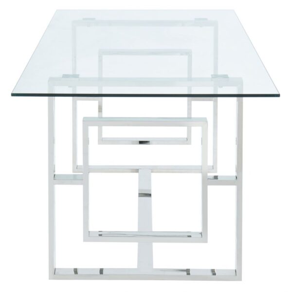 Open up your space with this beautiful contemporary dining table. The silver finish on the unique geometric-patterned legs gives a little sparkle to the light and airy look of the glass-topped table. It will look stunning with four chairs but will comfortably accommodate 6 – and mix and match with different chair styles and finishes to create the perfect look that works for you!