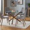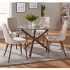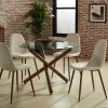 This contemporary piece will make your home resemble an art gallery with its unique and stunning design. Combining metal and glass elements, this dining table is the perfect match for a variety of different chair styles. Incorporating a 10mm tempered clear glass tabletop on top of metal legs that have a walnut finish through the process of heat transferring, the illusion of crisscrossing geometric shapes makes this piece a conversation starter. Detailed with chrome-finished glass holders and table feet, this dining table seamlessly blends a fun and visually interesting appearance with a captivating style. A perfect place to gather for meals, formal or casual.
