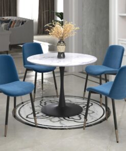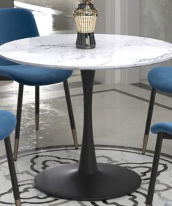 This sturdy pedestal dining table will easily become the centrepiece of your dining space. The curves of the base provide mid-century appeal while the faux marble top gives a modern touch. Comfortably fit 4 chairs, great for formal or casual dining.