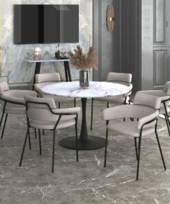 This sturdy pedestal dining table will easily become the centrepiece of your dining space. The curves of the base provide mid-century appeal while the faux marble top gives a modern touch. Comfortably fit up to 6 chairs, great for formal or casual dining.