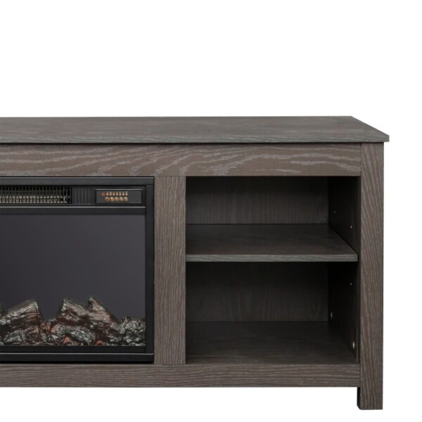 collection brings all the warmth and coziness you need into your living room with a design that doubles as a TV stand and a fireplace. Built to hold a television up to 64 inches wide, this compact unit features open shelving where you can store your media accessories. When you feel like warming up, simply use the remote control and sit back while the realistic electric flames crackle. Easily customize your desired temperature and set it and forget with the convenient timer. Subtle framing details with a grey faux wood finish give the Brenna a contemporary vibe that will instantly enhance wherever it is placed; staying in to watch TV never seemed so enticing!