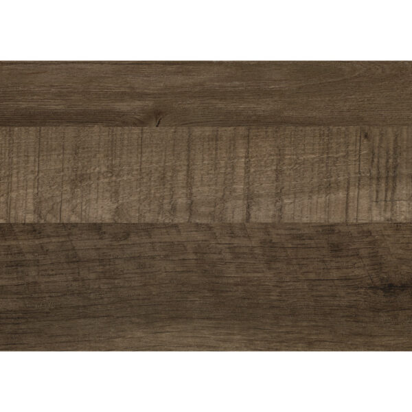 Gunmetal finish provides distinct contrast to printed brown wood grain melamine veneer in the Dogue collection. The 63-inch TV stand features open display shelving and door storage.