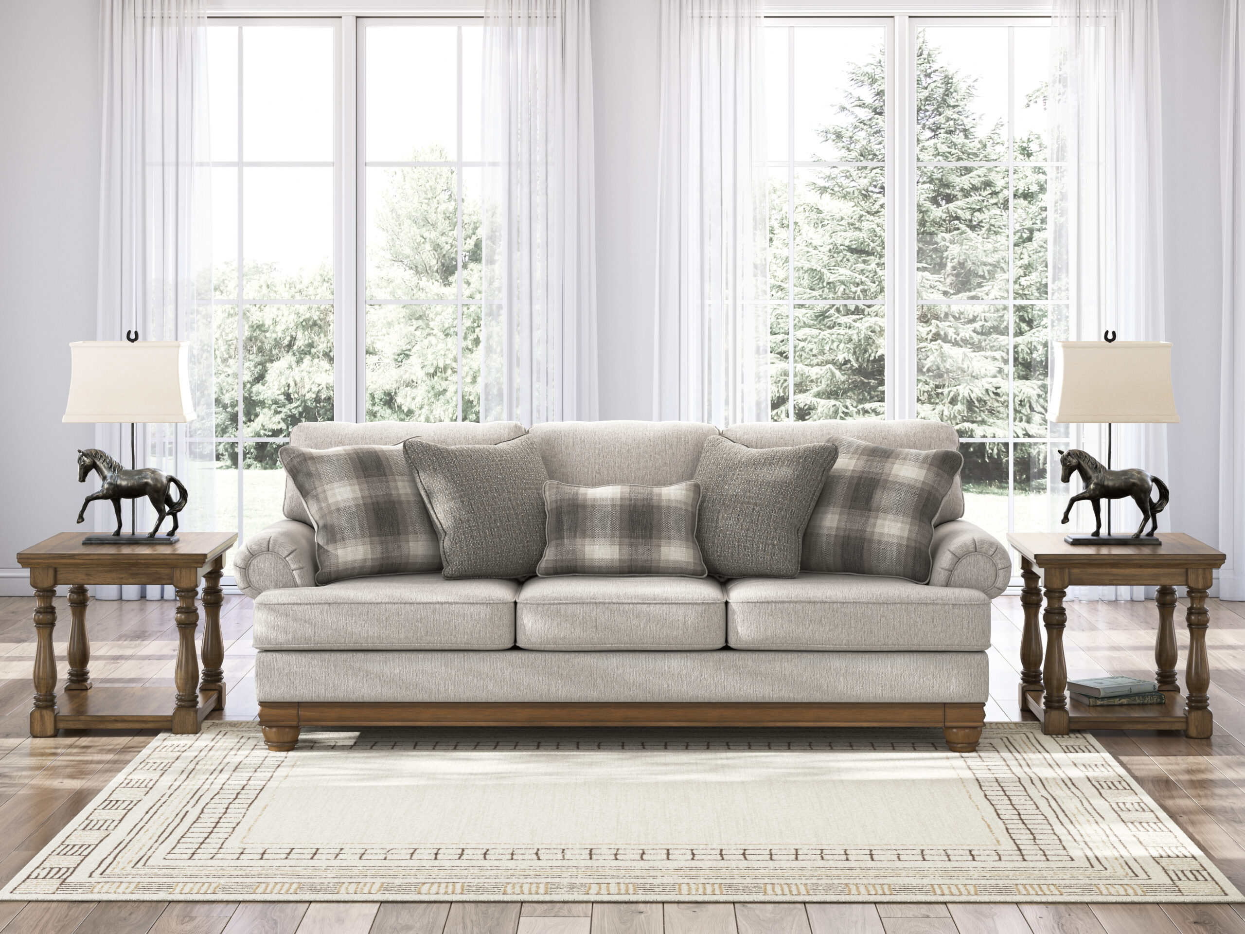 Fresh yet classic. That’s the beauty of this sofa. Dressy and also soft to the touch, its organic neutral-toned upholstery is sure to bring a transitional farmhouse aesthetic to your living space. Accent pillows in windowpane plaid and textured solid hues infuse a cozy and inviting farmhouse sensibility, while a full wraparound base and decorative turned legs complete the sofa’s timeless look. It’s the perfect place to unwind with your besties after a long day.
