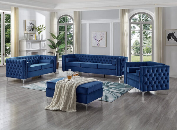 Blue Velvet With Deep Tufting and Nailhead Details, Chrome Legs and Accent Pillows.