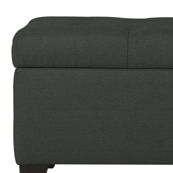 Items you keep in this ultra-deep storage ottoman may be out of sight and out of mind, but this piece can stay front and centre! A perfect add-in to any space for extra seating when needed and extra storage always available. The button-tufting design on the upholstered top is a fun design feature. Safety-stop hinges keep fingers safe by preventing any accidental slamming of the seat. Sturdy black legs provide stability and support in this versatile piece.
